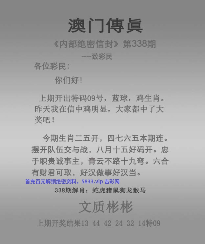 | 338期:绝杀三肖【蛇猴虎】开:發00中 |